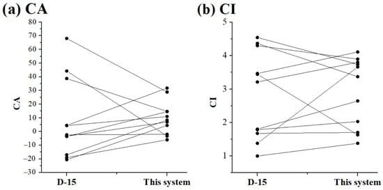 Wilcoxon signed-rank tests in (a) CA and (b) CI values between the D-15 test and the present CFCA method.