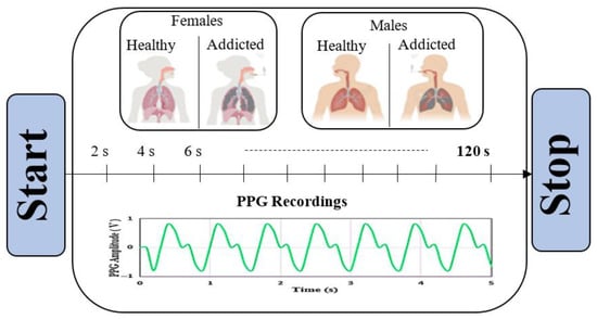 The PPG signals obtained from the participants were recorded at any time during the day for the non-smoking group, and the addicted group was recorded immediately after cigarette consumption (within 1–2 min of extinguishing the cigarette). This specific timing was chosen to capture the acute physiological response and regulation period following nicotine intake, which we hypothesized might correlate with dependency levels.