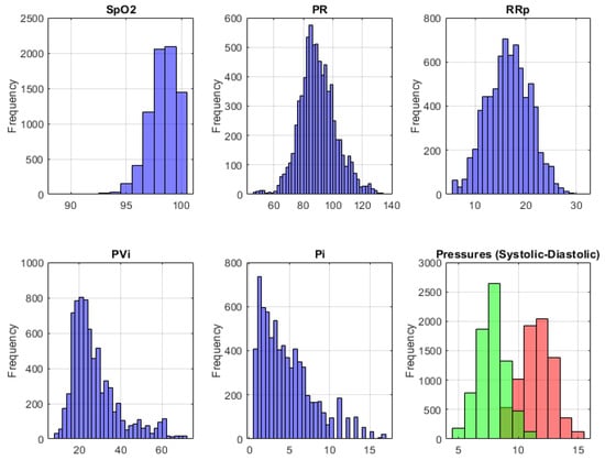 As shown in Figure 2, the Spo2 data form a left-skewed histogram. This is an expected situation because the normal oxygen saturation value should be between 95 and 100%. The PR graph, which expresses the pulse value, exhibits an ordinary histogram. It is normal for this value to be between 60 and 100/min. Similarly, it can be said that the RRp graph, which expresses the respiratory rate, also exhibits an ordinary histogram. The average respiratory rate in a normal individual is between 10 and 20/min. PVi is known as the pleth variability index and is the parameter that allows the automatic monitoring of dynamic changes that occur during the respiratory cycle. It is normal for these parameter data to exhibit a left-skewed histogram because the normal values of the parameter should be between 0 and 100%. Similarly, the perfusion index Pi parameter, which expresses the circulation rate, also exhibits a left-skewed histogram. The range value of this parameter is known as 0.02–20% and its average value is 1.4%. In the last graph, it was normal for systolic (green) and diastolic (red) blood pressure change histograms to form an ordinary histogram because normal blood pressure values should be 80–120 mmHg. As a result, all parameters of forming the dataset showed frequencies within the expected limits.