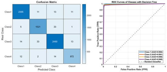 Figure 8 displays the classification performance of the Decision Tree model on the original dataset, presented through a confusion matrix and ROC curves. Analysis of the confusion matrix reveals that the correct classification rates for all classes are notably high, with misclassifications remaining at a low level. A distinct accuracy advantage is evident, particularly for Class 1, Class 3, and Class 4.