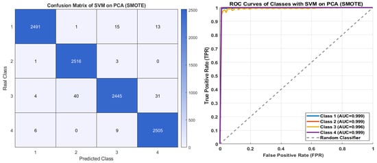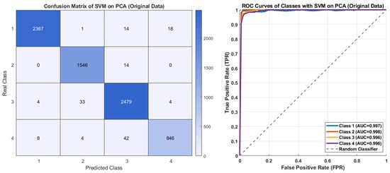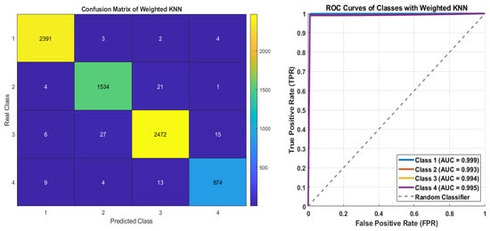 Figure 13 presents the confusion matrix and ROC curves of the KNN with PCA and class-weighting. The highest absolute performance was achieved for Class 3, with 2470 correctly classified samples, while Class 4, despite having only 858 samples, achieved 858 correct predictions, indicating exceptionally high precision. Class 1 (2369 correct) and Class 2 (1527 correct) also maintained consistently strong performance. The ROC curves and corresponding AUC values further confirm the balanced performance of the KNN model with class-weighting. An AUC of 0.998 for Class 1 indicates near-perfect separability, while Classes 2, 3, and 4 all achieved AUC values around 0.993, reflecting the model’s consistent sensitivity and fairness across all classes. The KNN model achieved balanced and reliable classification across the four classes, primarily due to the effectiveness of the weighting strategy.