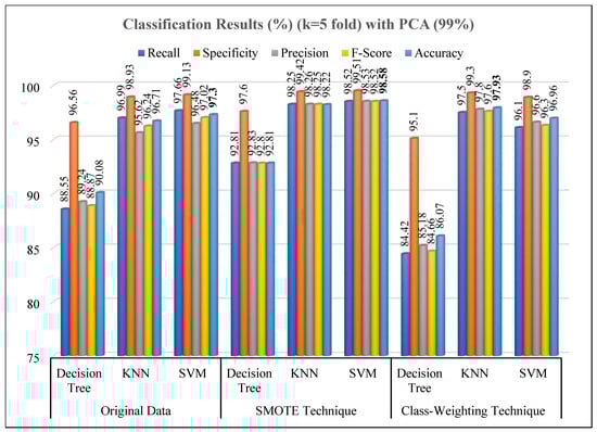 As seen in Figure 15, following PCA-based dimensionality reduction (99% variance retention), the classification performance exhibited minor changes depending on the model type and balancing strategy. Using the original PCA-reduced dataset, the SVM model achieved the highest accuracy (97.3%), followed by KNN (96.71%) and Decision Tree (90.08%). The reduced performance of the Decision Tree indicates a potential sensitivity to feature compression and loss of non-linear feature dependencies. Upon applying SMOTE after PCA, the models achieved their best overall results, especially the KNN classifier, which reached an accuracy of 98.22% and a specificity of 99.42%. The SVM model also exhibited strong generalization (accuracy: 98.58%), confirming that combining SMOTE with PCA enhances class separability by generating synthetic samples in the transformed feature space [,]. The class-weighting technique, in contrast, showed more inconsistent behavior. Although KNN maintained competitive accuracy (97.93%), the Decision Tree suffered a substantial decrease (86.07%), highlighting its sensitivity to feature compression and weighting imbalance. SVM, however, remained relatively stable (96.96%), again demonstrating its resilience to class imbalance effects [].