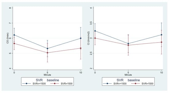 SVR trend according to the baseline CO (<5 L/min, >5 L/min) and baseline CI (<2.8 L/min/m2 and >2.8 L/min/m2) subgroup.