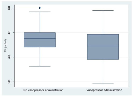 Boxplot showing the distribution of SVI at baseline in the group that received or not any vasopressive therapy.
