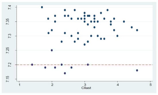 Regarding neonatal outcomes, we did not register any case of neonatal acidosis nor need for intensive care admission; 8 infants had an arterial pH lower than 7.20. We compared the last values of maternal CO and CI between neonates with a pH > 7.20 and those with pH < 7.20. CO and CI were lower in the group with lower pH, with only CI showing statistical significance (p = 0.043). The correlation between the last CI value and neonatal pH is detailed in Figure 4. This relationship was not observed when considering umbilical artery base excess at birth.