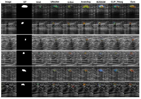 We employed Grad-CAM overlays to visualize image regions that most influenced the predicted masks (Figure 4). Among the compared methods, U-Net [], U-ResNet, U-KAN [], and AnatoSegNet [] are non-prompt methods; BUSSAM [] and CLIP-TNseg [] are prompt-guided; and XBusNet uses dual prompts (global and attribute-conditioned). Non-prompt baselines frequently display diffuse responses in low-contrast tissue, particularly posterior to the lesion, corresponding to missed or fragmented masks. Prompt-guided methods improve spatial correspondence; CLIP-TNseg may still exhibit scattered hotspots around speckle, whereas XBusNet shows concentrated activation adjacent to lesion boundaries and within the mass. For very small lesions, the salient regions for XBusNet overlap the recovered mask more consistently, in line with the small-lesion gains reported in Table 2. These visualizations are qualitative and are not treated as formal explanations.