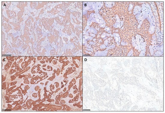(A,B) Tumor cells, in these two representative cases of mGTs from our series, show diffuse cytoplasmic expression of CD34 with moderate intensity (IHC for CD34, scale bar 250 μm and 50 μm). (C) All cases displayed strong and diffuse positivity for SMA (IHC for SMA, scale bar 250 μm), (D) as well as negativity for Desmin (IHC for Desmin, scale bar 100 μm).