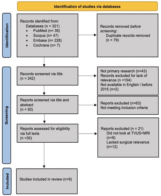 Studies were eligible for inclusion if they involved women with suspected or confirmed deep infiltrating endometriosis (DIE) who underwent both transvaginal ultrasound (TVUS) and magnetic resonance imaging (MRI) within the same patient cohort. Laparoscopy (coelioscopy) with histological confirmation is considered the gold standard for diagnosing endometriosis []. Each study was required to use surgical and/or histopathological confirmation, including laparoscopy, as the reference standard and to report diagnostic accuracy outcomes, such as sensitivity and specificity, for both modalities. Studies were also included if they reported outcomes relevant to surgical decision-making, either directly (e.g., surgical planning or MDT referral) or indirectly (e.g., lesion location, depth, or lesion-to-anal-verge distance).