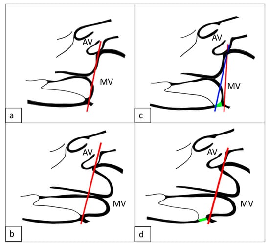 Mitral valve morphologies: (a) Normal reference without MAD or MVP (red line); (b) MVP with systolic leaflet displacement above the annular line (red line) without MAD; (c) MAD with superior annular displacement (blue line) and visible separation (green line) without MVP, normal Reference (red line); (d) combined MAD and MVP showing annular separation (green line) and systolic leaflet prolapse (red line). MAD: Mitral Annular Disjunction; MVP: Mitral Valve Prolapses; AV: Aortic Valve; MV: Mitral Valve.
