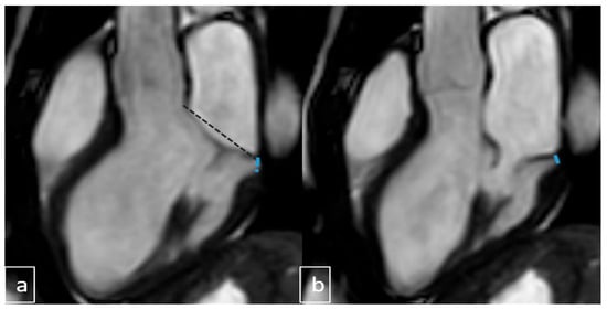 LVOT images: (a) end-systolic and (b) end-diastolic views. In cases with negative MVP but positive MAD, leaflets do not extend beyond the posterior hinge point. True MAD shows annular separation (dotted line: mitral annular diameter, blue lines: mitral annular separation area) from ventricular myocardium in both phases. LVOT: Left Ventricular Outflow Tract; MAD: Mitral Annular Disjunction.