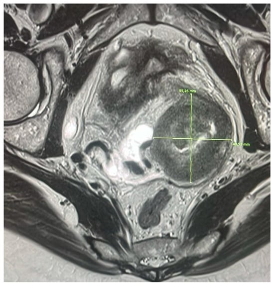 T2-weighted sequences are considered the most accurate method for three-dimensional tumor measurement, clearly surpassing clinical examination and transvaginal ultrasound. Bulky tumors appear as expansive masses with intermediate-to-high signal, replacing the normal cervical architecture. The lesion often appears heterogeneous, with central necrotic areas associated with greater biological aggressiveness [].