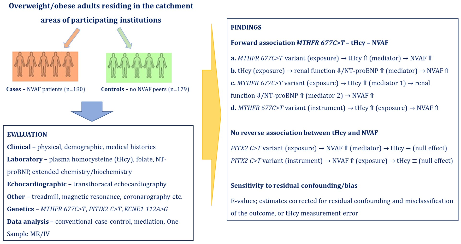 Levicki R, Trkulja V, Pašara V, Prepolec I, Matovinović M, Ganoci L, Šegulja D, Lovrić Benčić M, Božina T. Common Methylenetetrahydrofolate Reductase Polymorphism MTHFR 677C>T (rs1801133), Plasma Homocysteine, and Non-Valvular Atrial Fibrillation in Overweight/Obese Patients: Causality Indicated by Mediation and One-Sample Mendelian Randomization Analysis. Diagnostics. 2025; 15(22):2870. https://doi.org/10.3390/diagnostics15222870