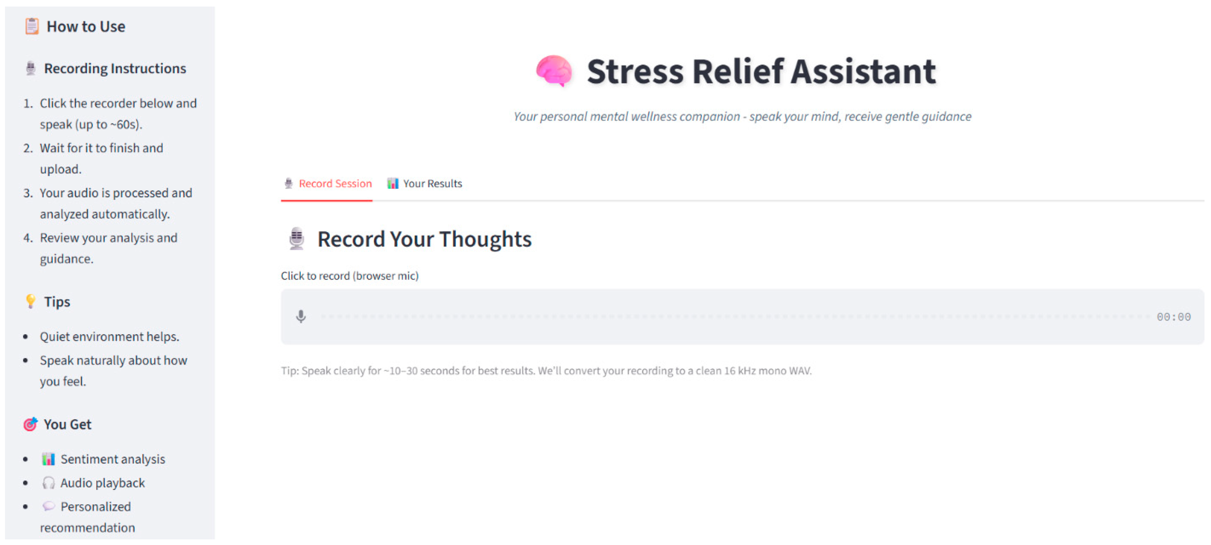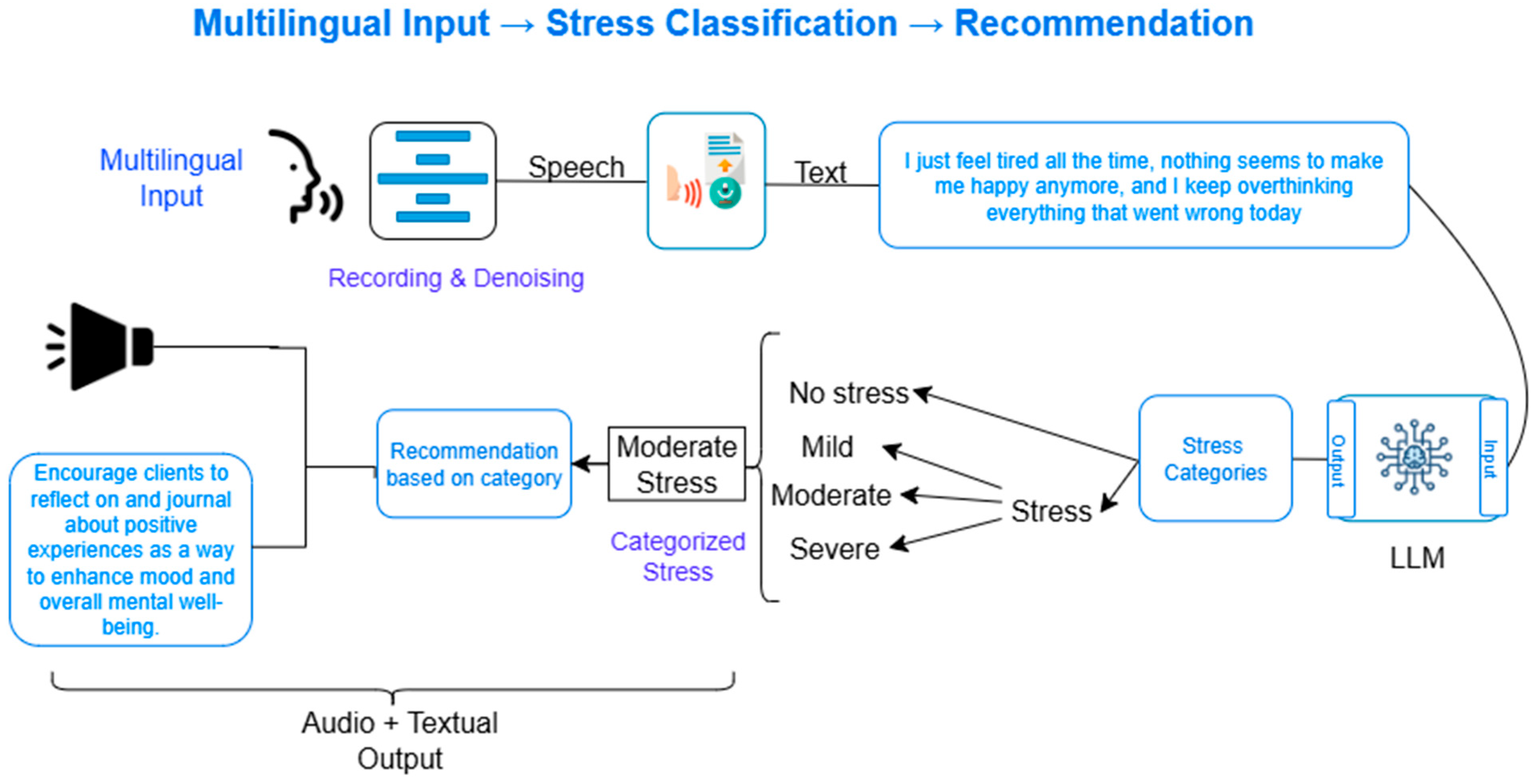• To design and implement a real-time stress detection system based on large language models (LLMs), integrating audio recording, speech-to-text conversion, and multimodal input–output capabilities (text and synthesized speech).