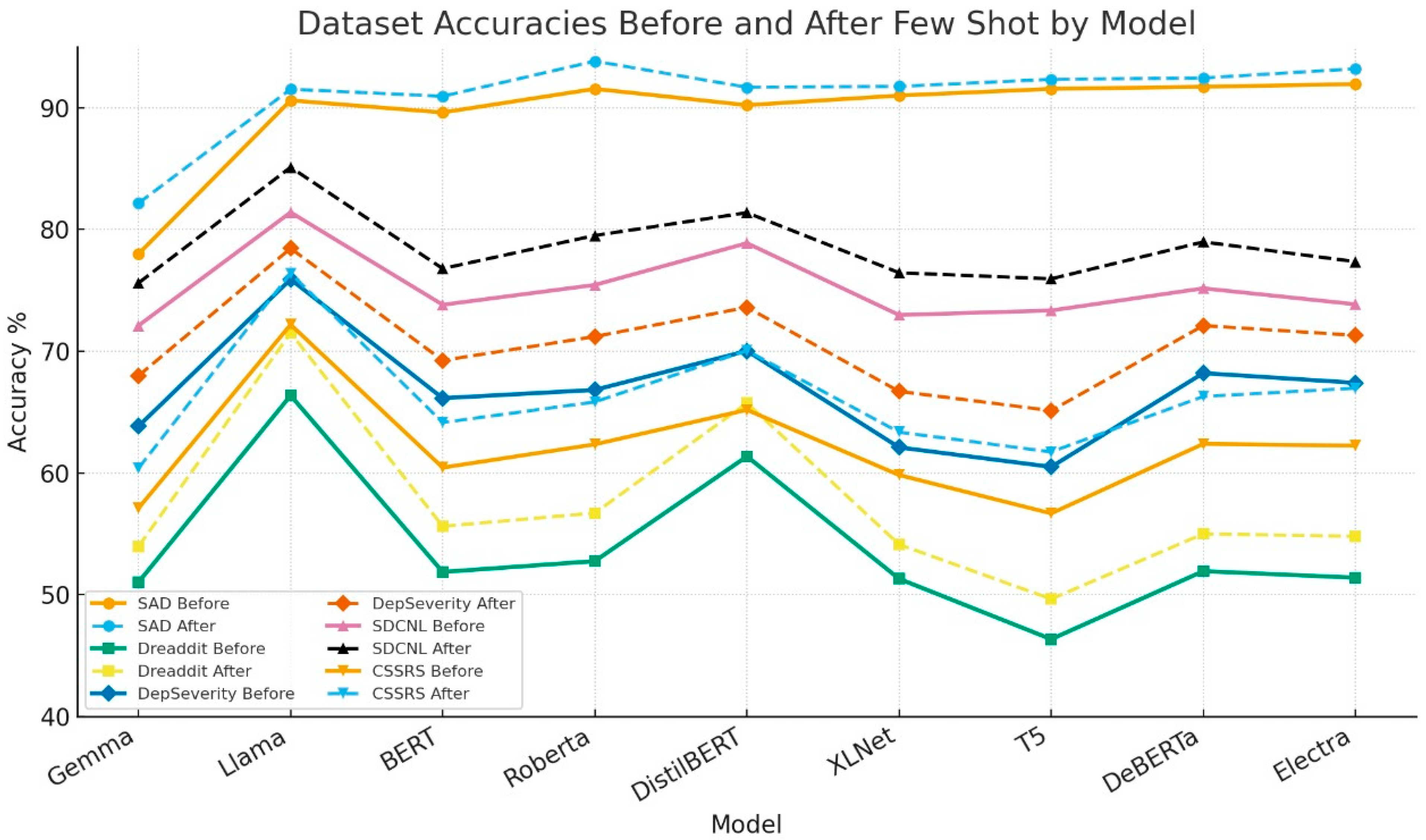 • To evaluate and compare transformer-based models across multiple benchmark stress-related datasets, analyzing accuracy, precision, recall, F1-score, and error rates in both zero-shot and few-shot learning settings.