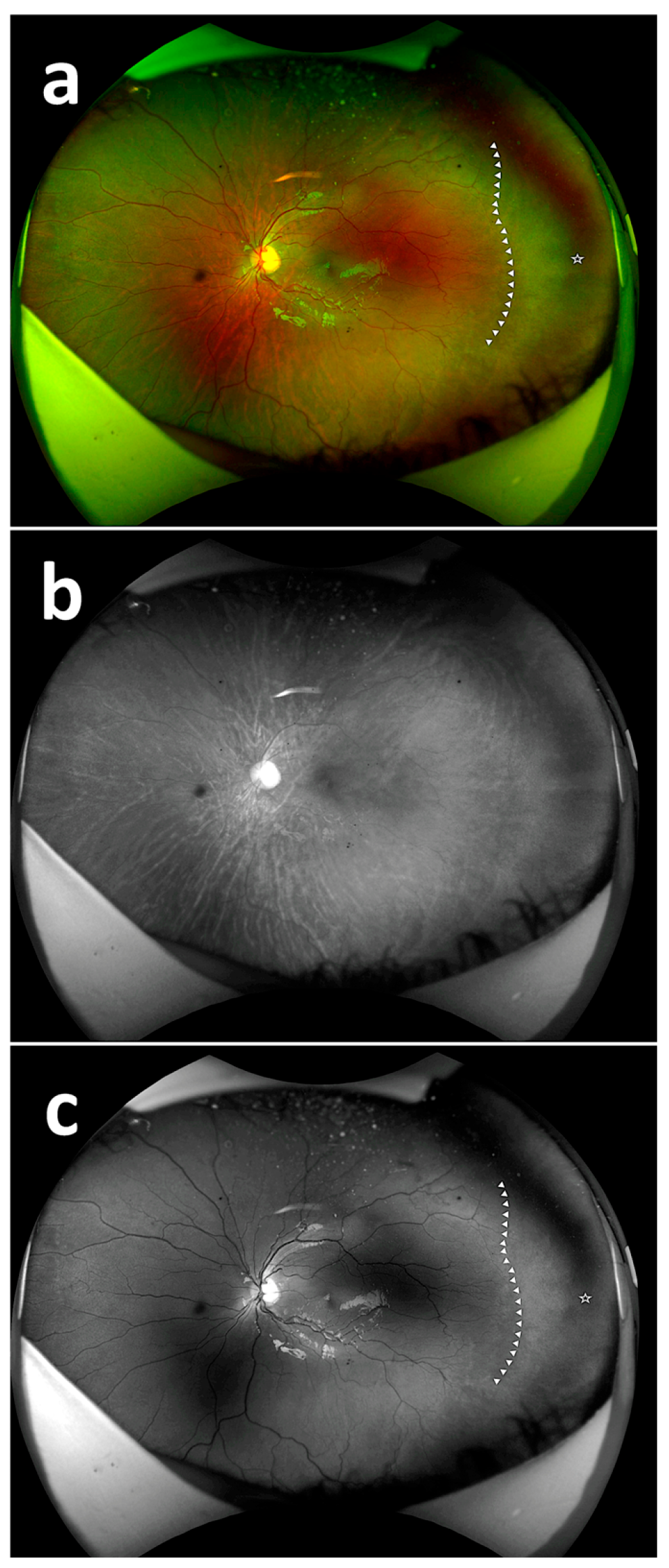 Figure 3. Fundus images with PAR. Fundus image with PAR using composite imaging (arrow: beginning of avascular zone, star: avascular area) (a); fundus image with PAR using red reflectance imaging (b); fundus image with PAR using green reflectance imaging (arrow: beginning of avascular zone, star: avascular area) (c).