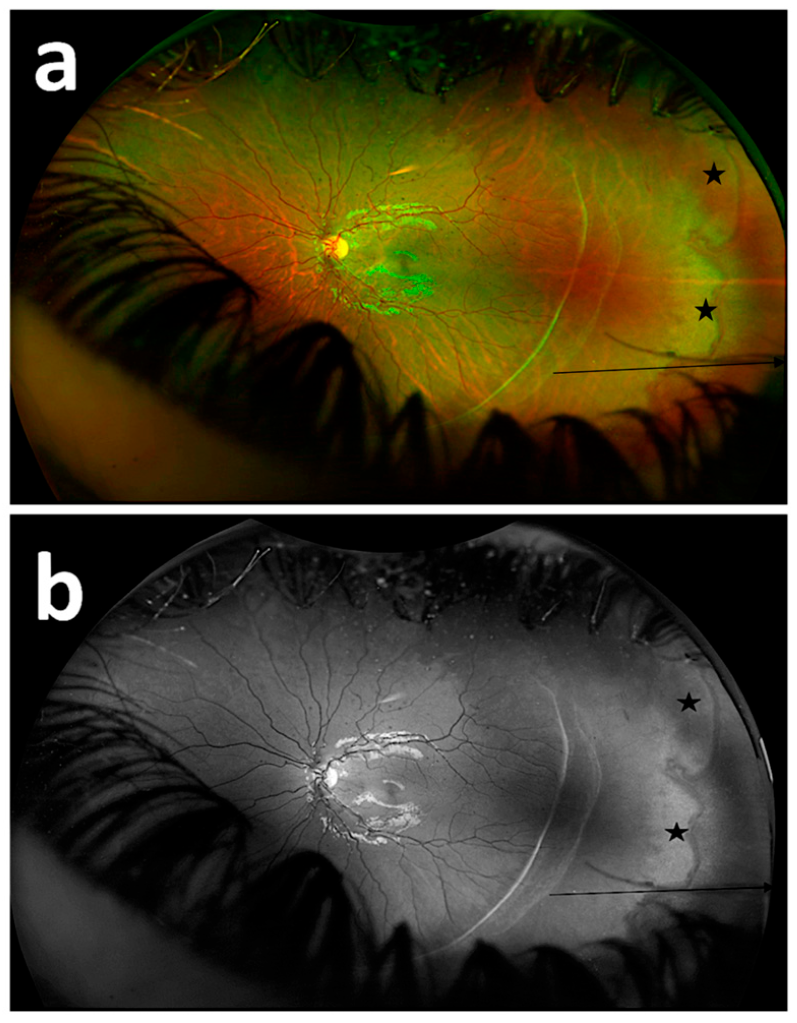 Figure 6. Fundus image of a patient with persistent avascular retina and white without pressure (WWP). Fundus image using composite imaging (a); fundus image using green reflectance imaging (b). (arrow: persistent avascular area, star: WWP).