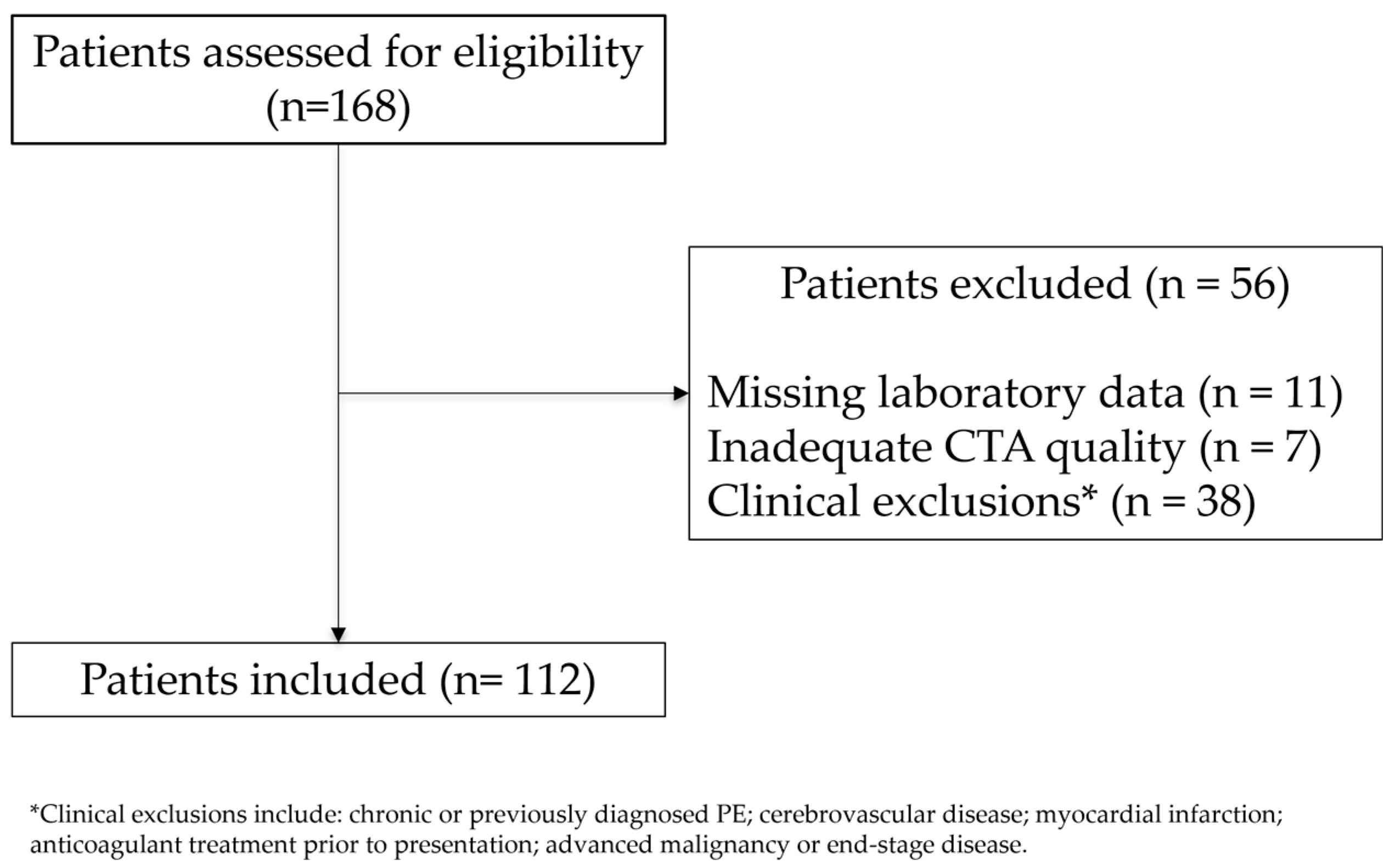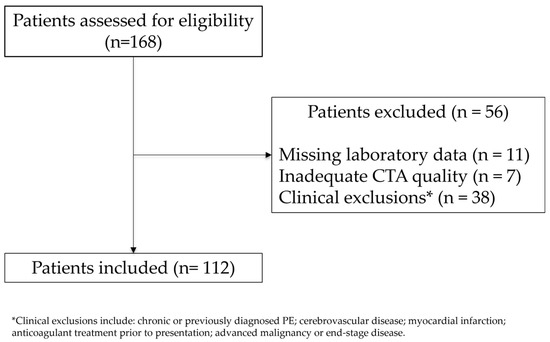 Inclusion criteria comprised the availability of a diagnostic CTPA performed within 24 h of emergency department admission and complete laboratory data, including D-dimer and fibrinogen levels, obtained at presentation. Patients were excluded if they had evidence of chronic or previously diagnosed pulmonary embolism, cerebrovascular disease, myocardial infarction, poor-quality CT scans precluding quantitative analysis, a history of advanced malignancy or end-stage disease or missing critical laboratory or imaging data. Patients under anticoagulant treatment before presentation were also excluded.