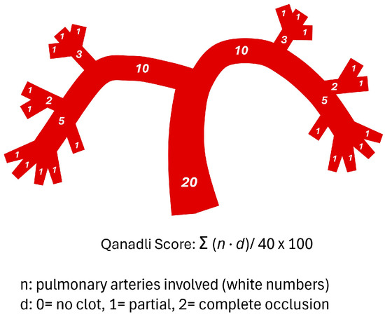 - Huang, W.-M.; Wu, W.-J.; Yang, S.-H.; Sung, K.-T.; Hung, T.-C.; Hung, C.-L.; Yun, C.-H. Quantitative Volumetric Computed Tomography Embolic Analysis, the Qanadli Score, Biomarkers, and Clinical Prognosis in Patients with Acute Pulmonary Embolism. Sci. Rep. 2022, 12, 7620. [Google Scholar] [CrossRef] [PubMed]