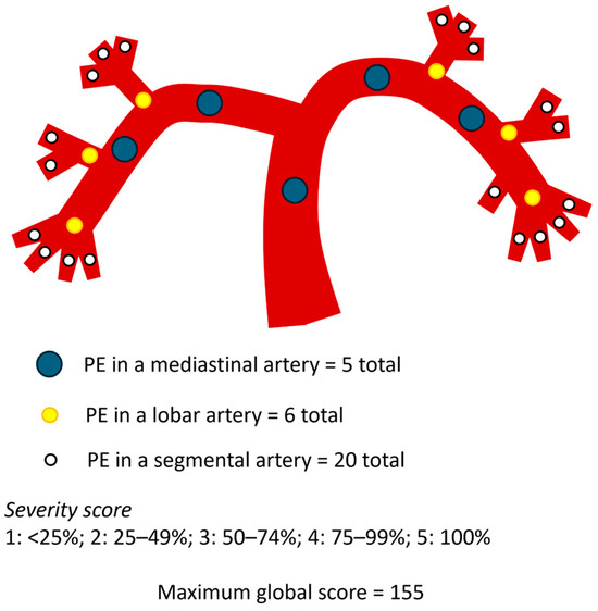 - Qanadli, S.D.; El Hajjam, M.; Vieillard-Baron, A.; Joseph, T.; Mesurolle, B.; Oliva, V.L.; Barré, O.; Bruckert, F.; Dubourg, O.; Lacombe, P. New CT Index to Quantify Arterial Obstruction in Pulmonary Embolism: Comparison with Angiographic Index and Echocardiography. Am. J. Roentgenol. 2001, 176, 1415–1420. [Google Scholar] [CrossRef]