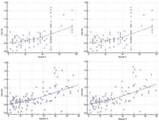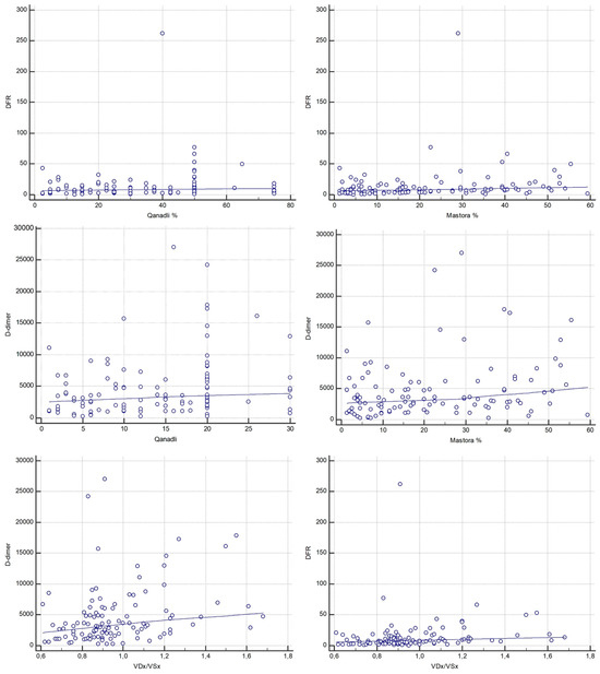 D-d/F showed a statistically significant weak positive correlation with both Qanadli (Spearman ρ = 0.233, 95% CI, 0.0498–0.401; p = 0.013) and Mastora scores (Spearman ρ = 0.274, 95% CI, 0.0937–0.438; p = 0.0034). D-dimer also showed a weak significant correlation with Qanadli (Spearman ρ = 0.240, 95% CI, 0.0575–0.408; p = 0.010) and Mastora scores (Spearman ρ = 0.248, 95% CI, 0.0659–0.415; p = 0.008) (Figure 5). However, Steiger’s Z-test revealed no statistically significant difference between the strength of correlations of D-d/F and D-dimer with either Qanadli (Z = 0.18, p = 0.857) or Mastora (Z = −0.65, p = 0.514).