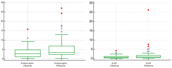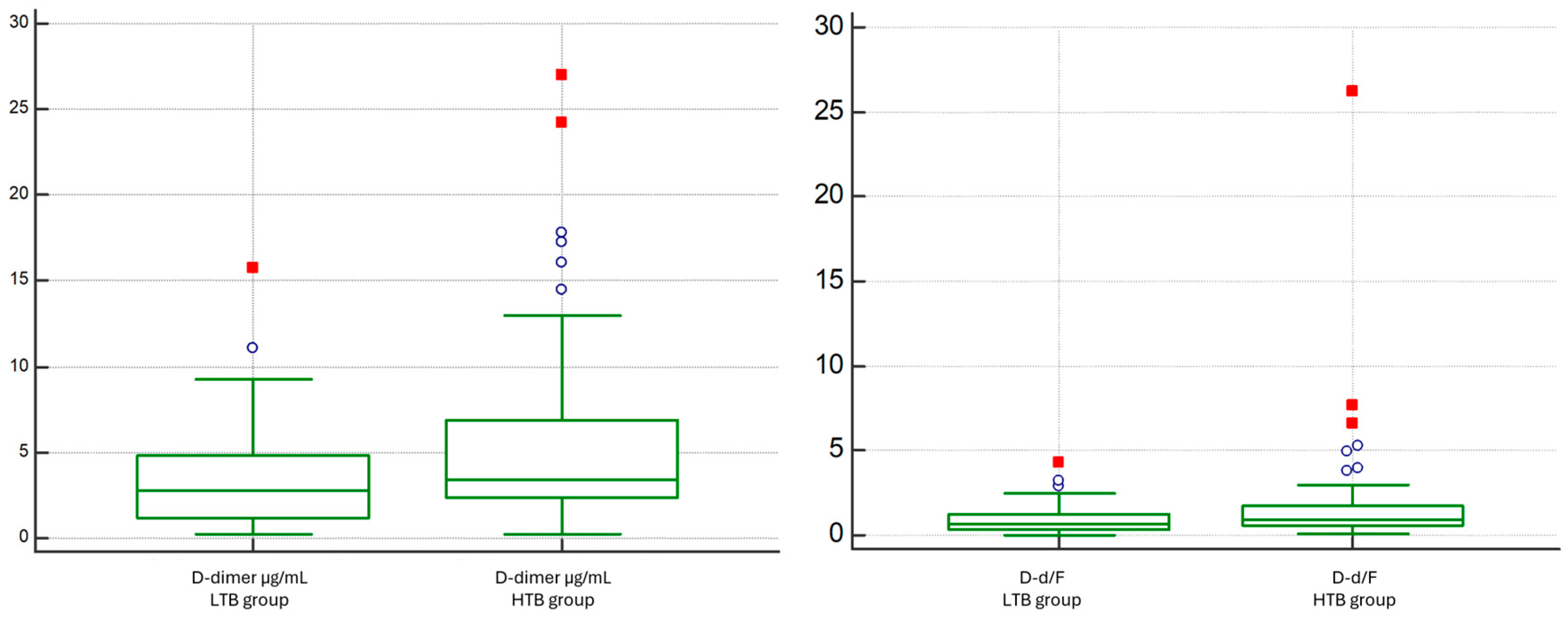 D-dimer levels were significantly higher in the HTB group compared to those of the LTB group (median 3.418 vs. 2.789 ng/mL; p = 0.0316). Conversely, fibrinogen levels did not differ significantly between the groups (median 364 vs. 417 mg/dL; p = 0.5729). Accordingly, the D-d/F showed an increasing trend in patients with HTB (median 0.63 vs. 0.88, p = 0.028) (Figure 7).