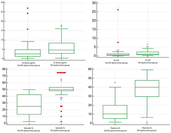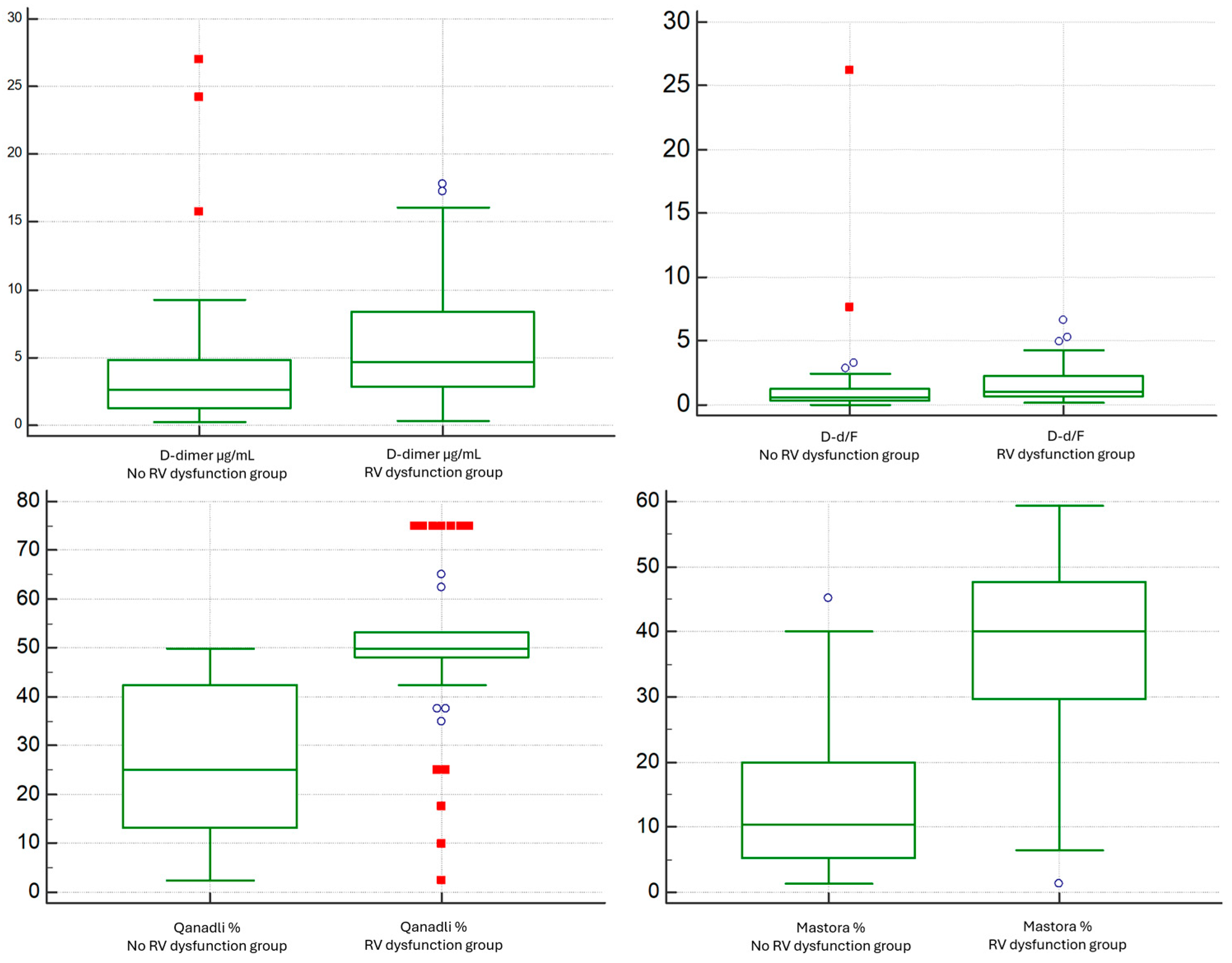 Subgroup comparisons for the predefined strata—Low vs. High Thrombotic Burden (Qanadli < 40% vs. ≥40%) and No RV Dysfunction vs. RV Dysfunction (RV/LV < 1.0 vs. ≥1.0)—were performed using the Mann–Whitney U test for continuous variables (D-dimer, fibrinogen, D-d/F; Qanadli%, Mastora%, RV/LV, PA/Ao) and χ2 or Fisher’s exact test for categorical variables, as appropriate. Results for continuous variables are reported as median (IQR), with two-sided p-values and a significance threshold of p = 0.05.