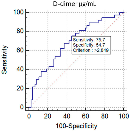 At emergency department admission, venous blood (2 mL) was drawn within 6 h into 3.2% sodium citrate tubes (9:1). The samples were centrifuged at 3000 rpm for 5 min at room temperature to obtain citrated plasma. D-dimer was measured by a latex-enhanced immunoturbidimetric assay on an ACL TOP 300 analyzer (Instrumentation Laboratory/Werfen) and reported as fibrinogen-equivalent units (µg/mL FEU). Fibrinogen was determined using the Clauss method on the same platform and reported in milligrams per deciliter (mg/dL).