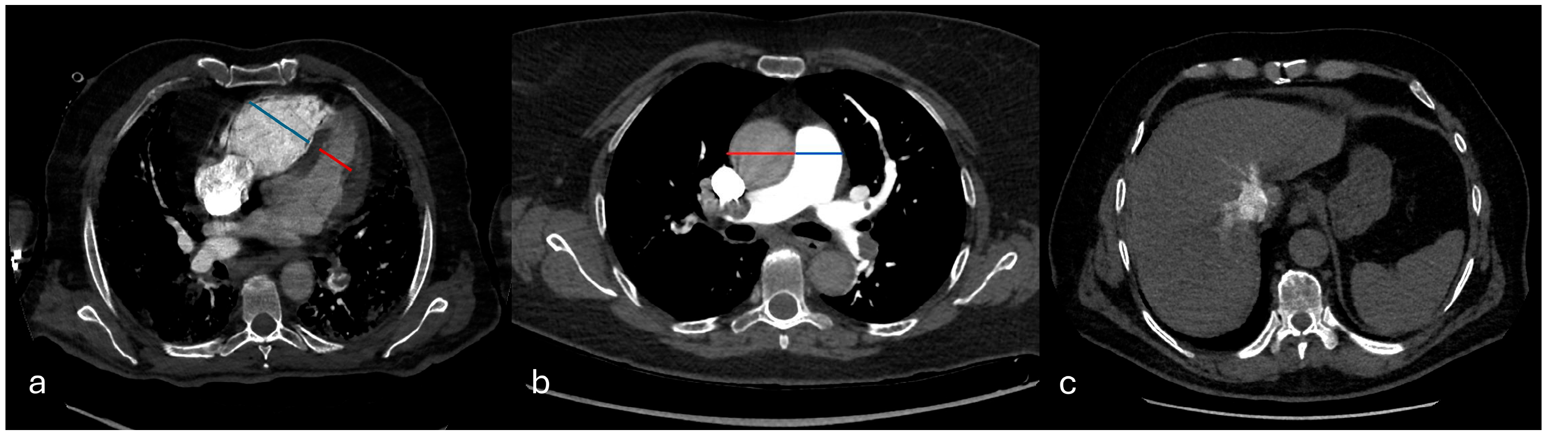 Right ventricular dysfunction (RVD) was evaluated based on three criteria: a right-to-left ventricular short-axis diameter ratio (RV/LV) measured on the same axial slice at the valvular plane, using inner-edge-to-inner-edge calipers, so that both cavities were sampled in the same cardiac phase (normal value < 1), interventricular septal bowing toward the left ventricle (deviation of the interventricular septum was evaluated as follows: normal (convex toward the RV), flattened, and septal bowing (convex toward the left ventricle), and contrast reflux into the inferior vena cava (IVC) graded ≥ 2 on a four-point scale. The main pulmonary artery diameter (PA) and ascending aorta (Ao) diameter were also recorded, and the PA/Ao ratio was calculated (Figure 4).
