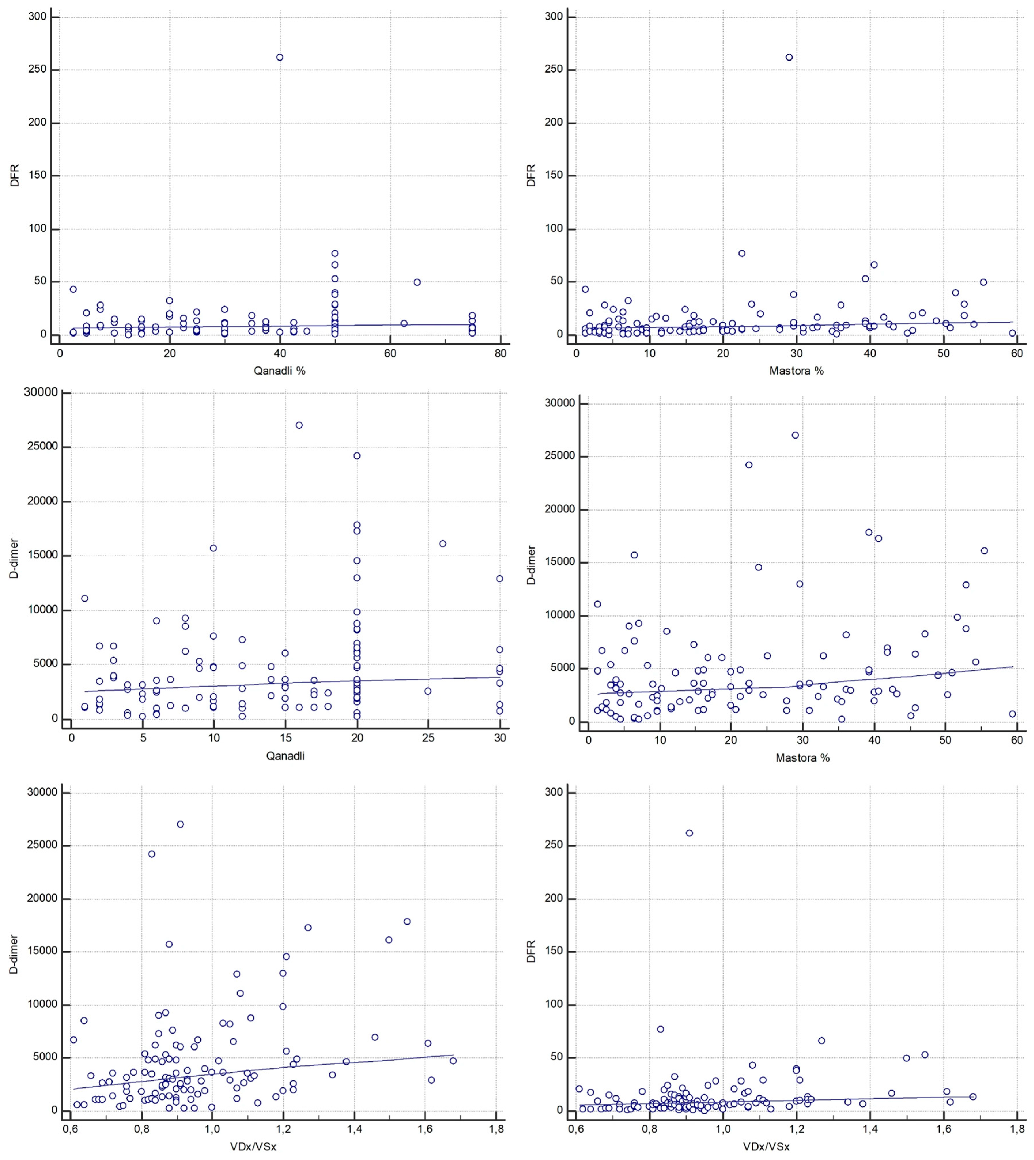 Figure 5. Correlations between laboratory markers (D-d/F and D-dimer), CT obstruction indices (Qanadli and Mastora) and CT-derived RV/LV short-axis ratio (VDx/VSx).