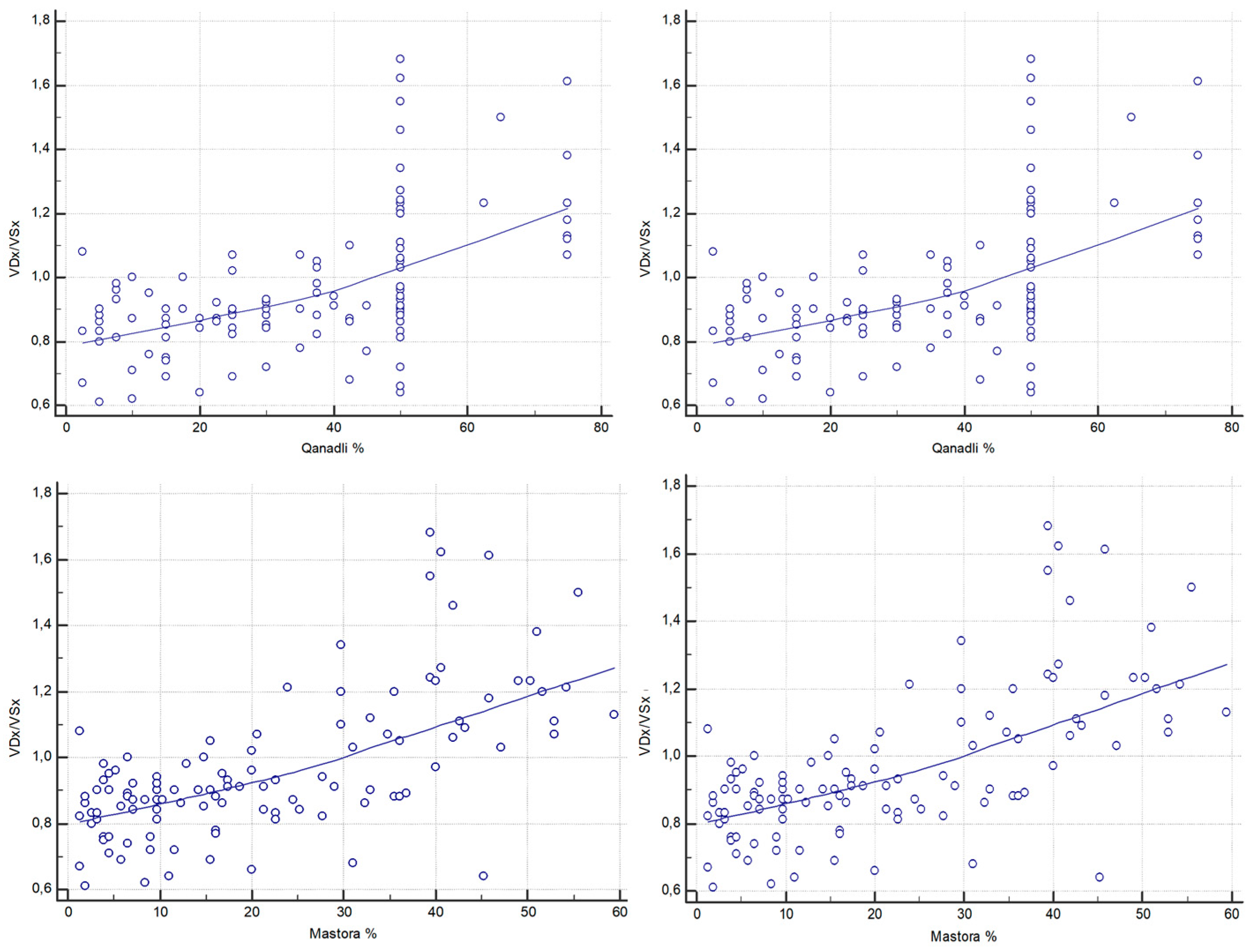 Figure 6. Correlations between CT-derived RV/LV short-axis ratio (VDx/VSx) and CT obstruction indices (Qanadli and Mastora).