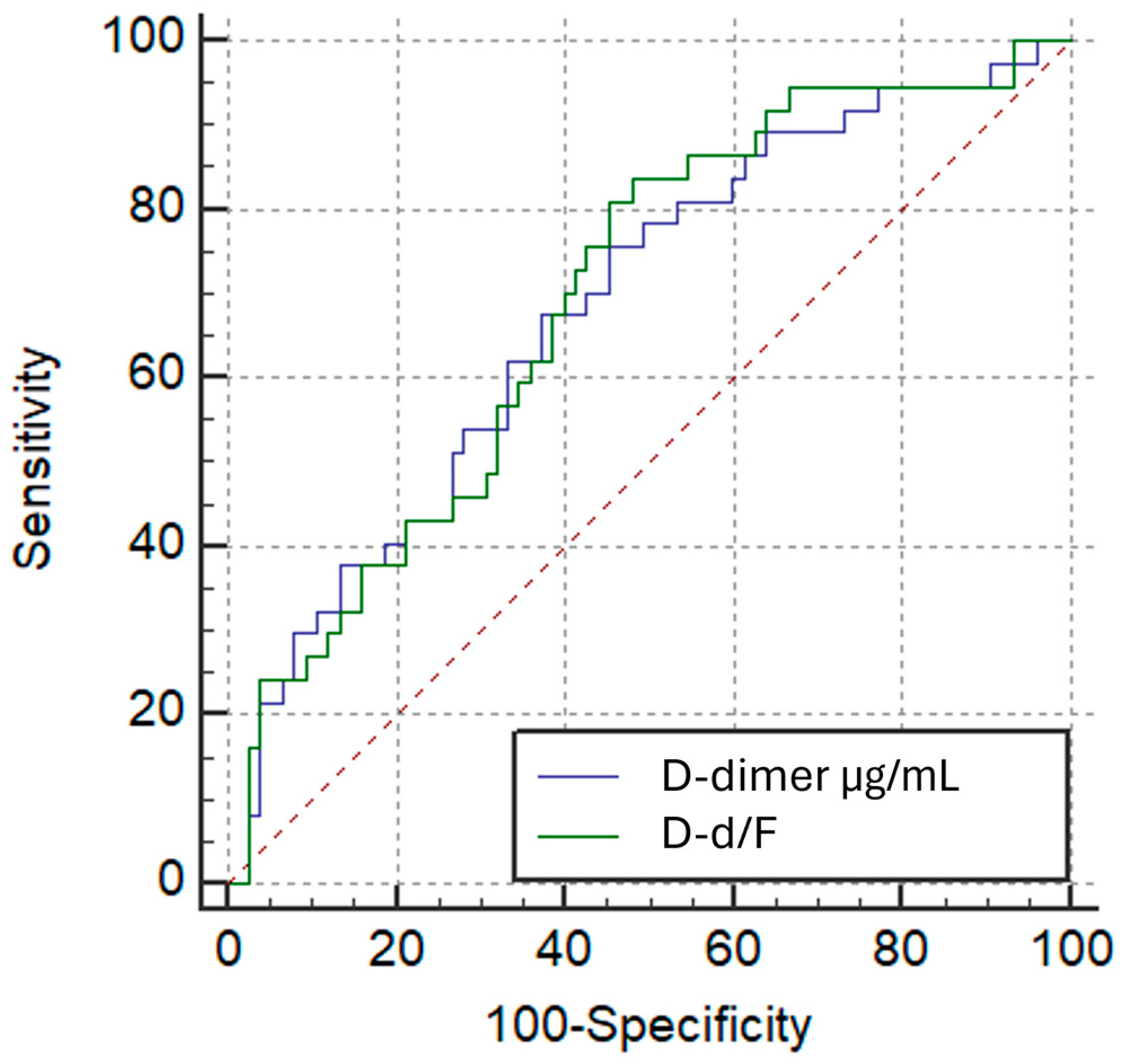 Receiver operating characteristic (ROC) curve analysis showed that both D-d/F ratio and D-dimer had comparable performance in identifying patients with Qanadli ≥ 40%, with modest areas under the curve (AUC) of 0.621 (95% CI: 0.524–0.711; p = 0.0233) and 0.618 (95% CI: 0.522–0.708; p = 0.0265), respectively. The difference in AUC between the two markers, as determined by the DeLong test, was not statistically significant (AUC difference: 0.00225; p = 0.9256) (Figure 8). The optimal cut-off point for the D-d/F ratio was >0.795, yielding a sensitivity of 58.8% and a specificity of 62.3%, whereas D-dimer > 1.894 µg/mL yielded a sensitivity of 84.3% and a specificity of 37.7%.