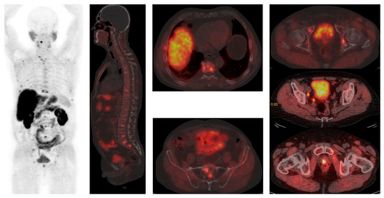 PSMA PET/CT is an important imaging modality in metastatic castration-resistant prostate cancer (mCRPC), offering high sensitivity and specificity for the detection of PSMA-expressing metastatic lesions. Most patients with mCRPC develop bone metastases. In addition, visceral metastases correlate with new aggressive histological variants. PSMA-PET/CT shows a higher sensitivity in detecting lymph node, bone, and visceral metastases compared to conventional imaging [31]. It identifies PSMA-avid lesions, which are common in CRPC, and is also crucial for the selection of patients for PSMA-targeted radioligand therapy (e.g., [177Lu]Lu-PSMA-617) [31]. Additionally, PSMA PET/CT can reveal heterogeneity in PSMA expression, which is critical for guiding combination therapy or switching to [18F]FDG PET/CT for PSMA-negative, FDG-positive lesions. This dual-tracer method is particularly beneficial in advanced mCRPC cases [31].