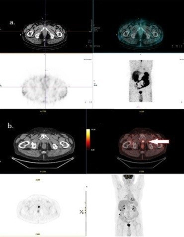Nowadays, the use of choline PET/CT has been largely replaced by prostate-specific membrane antigen imaging (PSMA) (Figure 1). Choline PET/CT may have potential in the small subset of PSMA-negative cases.
