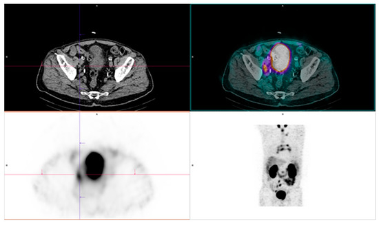 In metastatic castration-resistant prostate cancer (mCRPC), targeted radioligand therapy (RLT) using 177Lu has demonstrated significant success in treating advanced stages of the disease [22]. Metastatic castration-resistant prostate cancer patients represent a highly heterogeneous group, both in terms of prior treatment and tumor biology. Parameters which may help in predicting and optimizing response rates to RLT include [18F]FDG PET/CT. It appears that semiquantitative measurement of FDG uptake at baseline can be useful and can provide independent prognostic information on overall survival in mCRPC [23,24].