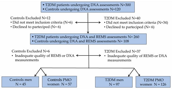 Three hundred consecutive Caucasian outpatients with Type 2 diabetes mellitus (129 men and 171 women) were recruited between January 2024 and June 2025 from the Diabetes Unit, Department of Internal Medicine, at the University Hospital of Siena. All participants provided written informed consent. The study was approved by the Institutional Review Board of Siena University Hospital (ID-21211/21; approved on 13 December 2021). All data were anonymized prior to statistical analysis. Eligibility criteria included: age between 50 and 80 years; postmenopausal status for women; body mass index (BMI) ranging from 18.5 to 39.9 kg/m2; age at T2DM diagnosis >30 years; and glycated hemoglobin (HbA1c) < 7.5%. Patients with a history of anti-osteoporotic treatment (with the exception of calcium or vitamin D supplementation), malignant or metabolic bone diseases (e.g., cancer, multiple myeloma, hyperparathyroidism), or therapies known to affect bone metabolism were excluded. The control group comprised 120 consecutive non-diabetic individuals (53 men and 67 women), referred to the Outpatient Clinic of the same Department during the same study period, in addition to a small number of healthy volunteers recruited among the hospital staff. Inclusion criteria were identical to those applied to the T2DM cohort (age 50–80 years, BMI 18.5–39.9 kg/m2, and postmenopausal status for women). Non-diabetic subjects with comorbidities or receiving treatments potentially interfering with bone metabolism were excluded. For all participants, a comprehensive personal and family medical history was obtained, including information on smoking habits, alcohol consumption, menopausal duration, T2DM duration, and concomitant comorbidities. Anthropometric measurements were collected under standardized conditions: height and weight were recorded, and BMI was calculated as weight (kg) divided by height squared (m2). A total of 52 individuals (40 with T2DM and 12 controls) were excluded because they did not meet the inclusion criteria or withdrew consent, and 43 (37 with T2DM and 6 controls) were excluded due to poor-quality BMD or REMS scans. The final analysis included 223 participants with T2DM and 102 controls. The flow chart showing the distribution of participants in the study is presented in Figure 1.