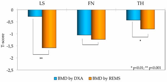 As illustrated in Figure 2, a clear and statistically significant disparity was observed between the two measurement modalities. The mean T-scores for BMD determined by REMS were substantially lower than the corresponding DXA T-scores at the lumbar spine (p < 0.001) and the total hip (p < 0.01).