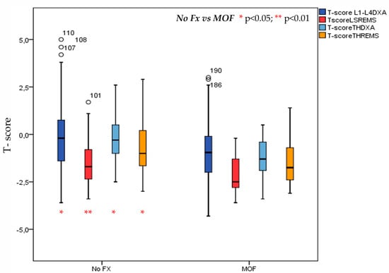 Figure 5 illustrates the Trabecular Bone Score, measured by DXA, and the Fragility Score, measured by REMS, in patients with T2DM with or without MOF. As expected, patients with a history of MOF had significantly lower TBS values and significantly higher FS values at both lumbar and femoral sites compared with those without fractures (p < 0.05).