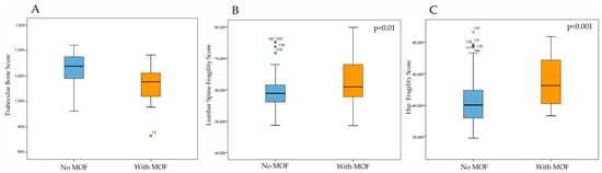 Trabecular Bone Score by DXA (A), Fragility Score at lumbar spine (B) and Fragility score at hip (C) by REMS technique in DM2 patients with or without MOF.