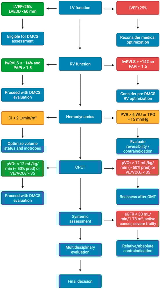 The multidisciplinary heart team plays a pivotal role in optimizing DMCS outcomes. The cardiologist and imaging specialist provide functional and structural assessments, and the cardiac surgeon evaluates technical feasibility and concomitant valve disease, while the anesthesiologist and intensivist manage perioperative optimization []. Psychologists and social workers assess adherence, cognitive status, and family support. Regular multidisciplinary meetings have been associated with lower rates of postoperative right heart failure and rehospitalization, confirming that team-based evaluations are as crucial as device selection itself [,].