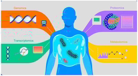 In recent years, multi-omics technologies have been integrated into sepsis research [,]. Compared to single omics capturing only one dimension of disease information, multi-omics integration achieves multi-dimensional dynamic parsing, significantly improving diagnostic precision and enhancing real-time monitoring of disease progression, thereby more systematically revealing the biological panorama of sepsis (Figure 2).