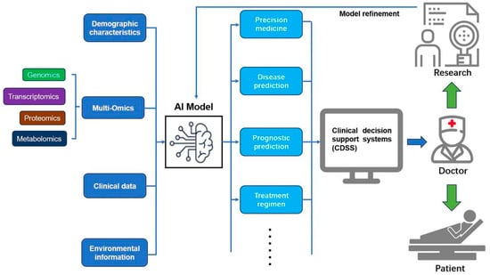 Artificial intelligence (AI) integrated with multi-omics data (genomics, transcriptomics, proteomics, metabolomics) enables feature extraction, pattern recognition, and dynamic monitoring of immune status in sepsis []. By processing vast datasets from electronic health records (EHRs) and omics layers, AI identifies biomarkers, predicts disease trends, and supports personalized treatment []. Systems like SepsisLab exemplify AI-driven clinical decision support (CDSS), enhancing early diagnosis, risk stratification, and real-time treatment adjustment while reducing decision uncertainty [,,,]. Deep workflow integration improves clinician trust and outcome optimization [,]. In summary, AI-omics fusion provides powerful tools for precision sepsis management, improving diagnostic accuracy and survival rates (Figure 4).
