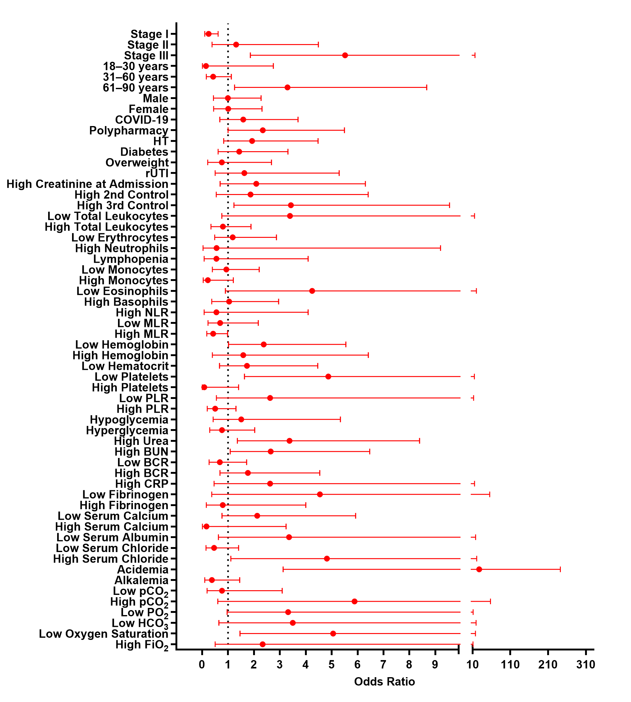 | Low Eosinophils | 22.46 | 2.18 | 231.61 | 0.0089 | * |