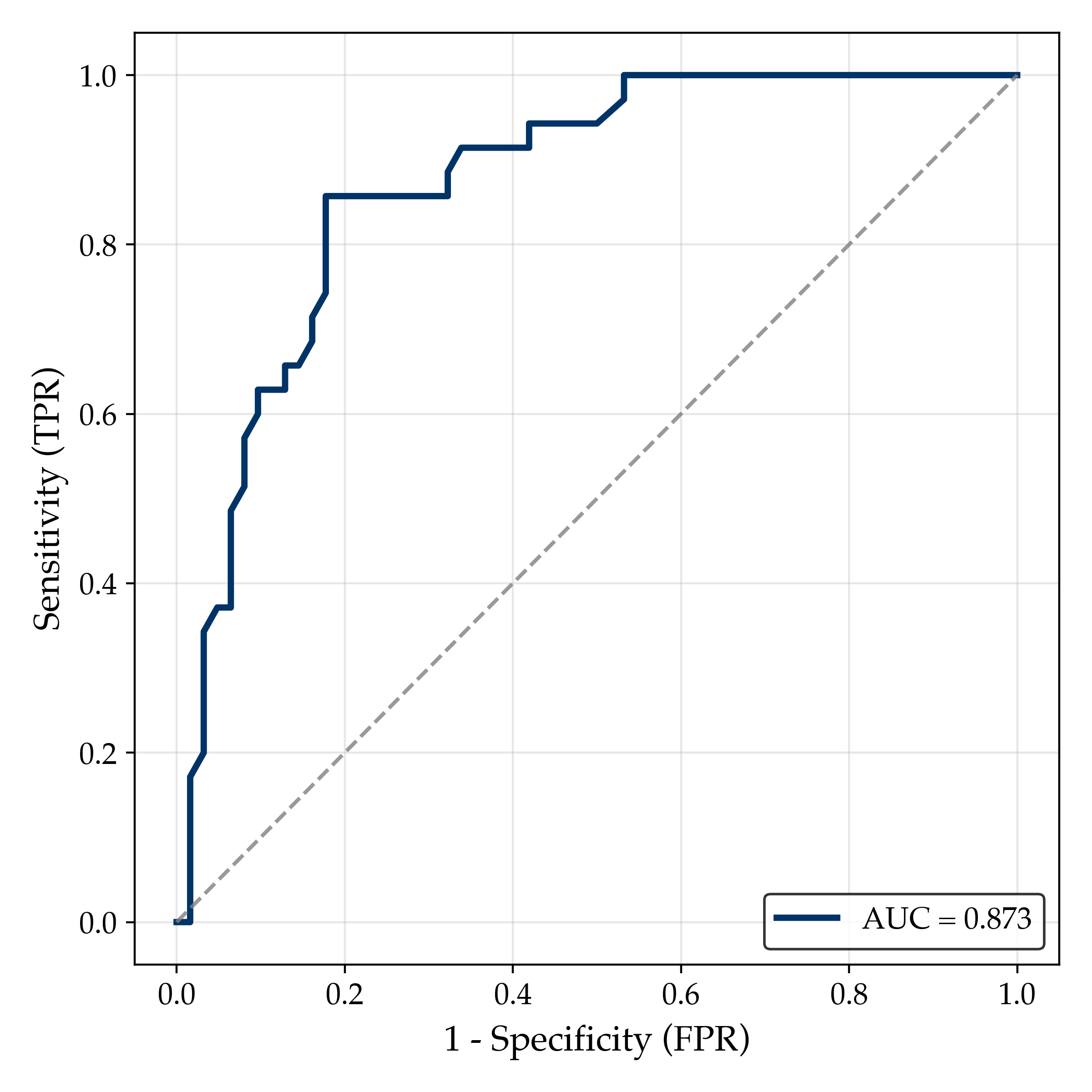 - The relatively small sample size (n = 106) may limit the statistical power and generalizability of the findings. However, the inclusion of a multivariable logistic regression model with excellent discriminative and calibration performance (AUC = 0.873; Brier score = 0.139) supports the internal validity and reliability of the results. Larger and more diverse cohorts are still needed to confirm these findings and to extend their applicability to broader populations.
