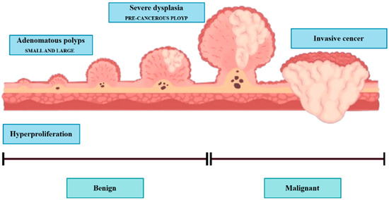 Polyps are generally divided into three stages: (1) hyperplastic stage, (2) adenomatous or precancerous stage, (3) malignant or CRC stage.