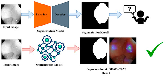 - Xiao, M.; Zhang, L.; Shi, W.; Liu, J.; He, W.; Jiang, Z. A visualization method based on the Grad-CAM for medical image segmentation model. In Proceedings of the 2021 International Conference on Electronic Information Engineering and Computer Science (EIECS), Changchun, China, 23–26 September 2021; IEEE: New York, NY, USA, 2021; pp. 242–247. [Google Scholar] [CrossRef]