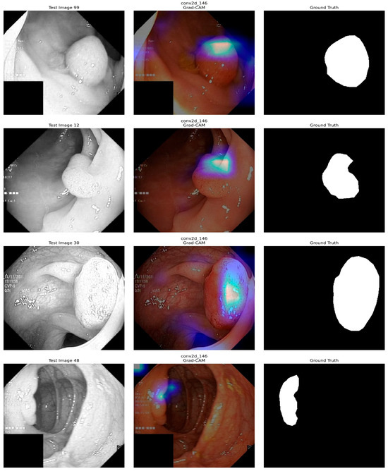 Figure 15 shows the application of Grad-CAM to visualize which part of the input images the deep learning model is based on its predictions. The first sample images represent the test images, which are images of a medical nature, such as a colonoscopy. The second test image shows the Grad-CAM heatmaps, in which the colored areas indicate where the model has been focusing on when making predictions, and the color intensity stands for focusing strength. The last images correspond to the Ground Truth masks, the manually drawn regions of interest. Typically, abnormal areas are shown in white on a black background. By contrasting the Grad-CAM results with Ground Truth, one can determine whether model attention is consistent with the true regions of interest and assess interpretability and quality. This analysis helps to determine whether the model properly attends to the relevant areas to make an accurate prediction.