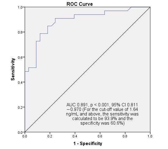 In addition to the fact that maternal serum scube-1 value was found to be statistically significantly higher in late-onset FGR cases, FUA-PI (r = 0.396, p = 0.001, Pearson correlation test) and MUA-PI (r = 0.396, p = 0.001 for right, r = 0.306, p = 0.012 for left, Pearson correlation test) values showed positive correlation. In contrast, maternal serum scube-1 level showed negative correlations with CPR (r = −0.379, p = 0.002, Pearson correlation test) and newborn birth weight (r = −0.444, p = 0.001, Pearson correlation test). No other significant correlations were found in relation to serum SCUBE-1 and Doppler parameters. When serum SCUBE-1 measurement value was used as diagnostic cutoff for late-onset FGR, if a value of 1.64 ng/mL and above was detected, the sensitivity was calculated to be 93.9% and the specificity was 60.6% (AUC 0.891, p < 0.001, 95% CI 0.811–0.970, Figure 1). For this cut-off value, the calculated positive predictive value was 70.5% and the negative predictive value was 90.9%. A weak negative correlation, although not statistically significant, was found between oxidative stress parameters and gestational week (r = −0.224, p = 0.70 for SCUBE-1; r = −0.047, p = 0.708 for IMA). Also, a weak negative correlation was found between fetal birth weight and SCUBE-1 level (r = −0.444, p < 0.001).