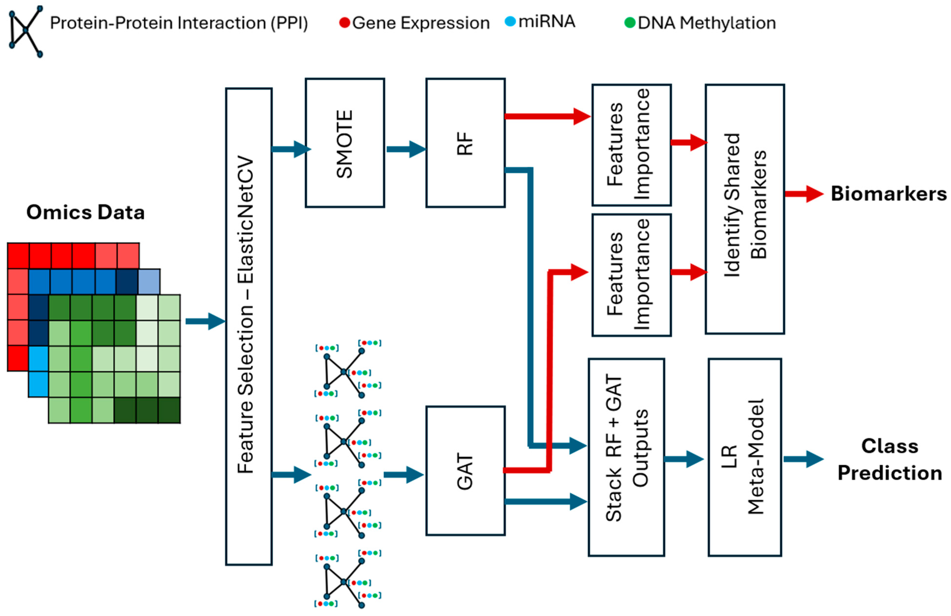 The hybrid framework that is proposed is based on feature selection, graph learning, and stacking ensemble modeling to enhance multi-omics classification and biomarker discovery. First, ElasticNet is used on mRNA, miRNA, and DNA methylation data to narrow down the most informative and nonredundant features, which is essentially a dimensionality reduction step. The chosen features are subsequently subjected to two complementary models, an RF which scores the importance of the features used in the identification of biomarkers and a GAT which is based on a Protein–Protein Interaction (PPI) network that can learn the relational patterns between the genes. Logistic Regression stacking is used to combine prediction outputs of both models to increase accuracy of the classification and stability of the models. RF feature importance is used to identify the most important biomarkers, which are then selected based on topological relevance in the GAT and offer interpretable information regarding the biological process involved.