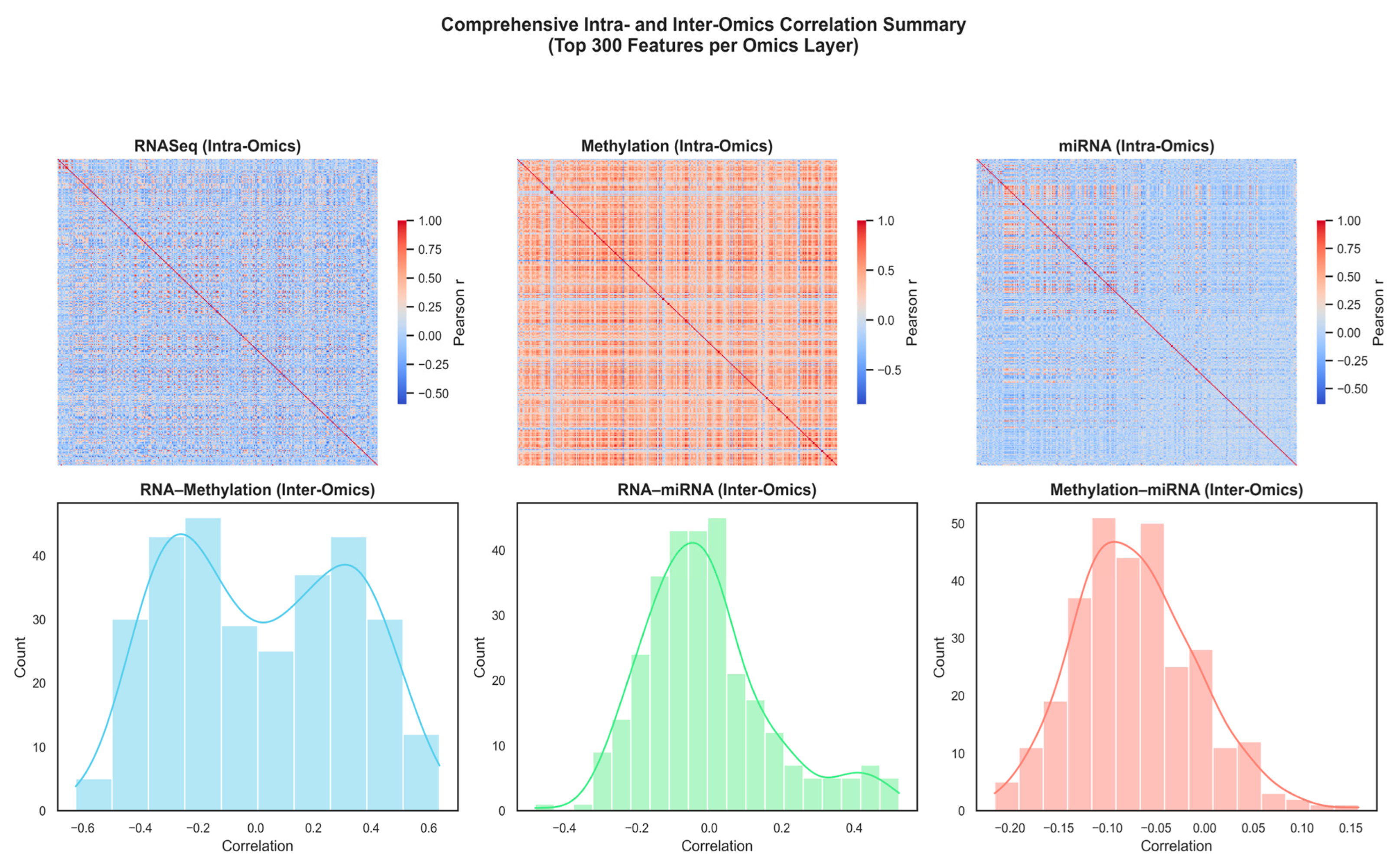 Figure 2 (upper panels), the intra-omics correlation heatmap of RNA-Seq and DNA methylation demonstrates dense positive correlation, which indicates coordinated epigenetic regulation and coherent gene co-expression. The heatmap also shows that the internal correlation of the miRNA is weak, which reflects its heterogeneous expression behavior and the diversity of its broader regulation. The inter-omics correlation distributions (lower panels) reveal positive and negative correlations between omic layers, especially between RNA-seq and methylation, which reveal a close relationship between transcriptional activity and epigenetic regulation in the low-grade glioma biology. This illustrates that each omic layer can provide complementary regulatory data, thus supporting the value of integrating multi-omics data to describe the complex molecular heterogeneity underlying glioma subtypes.