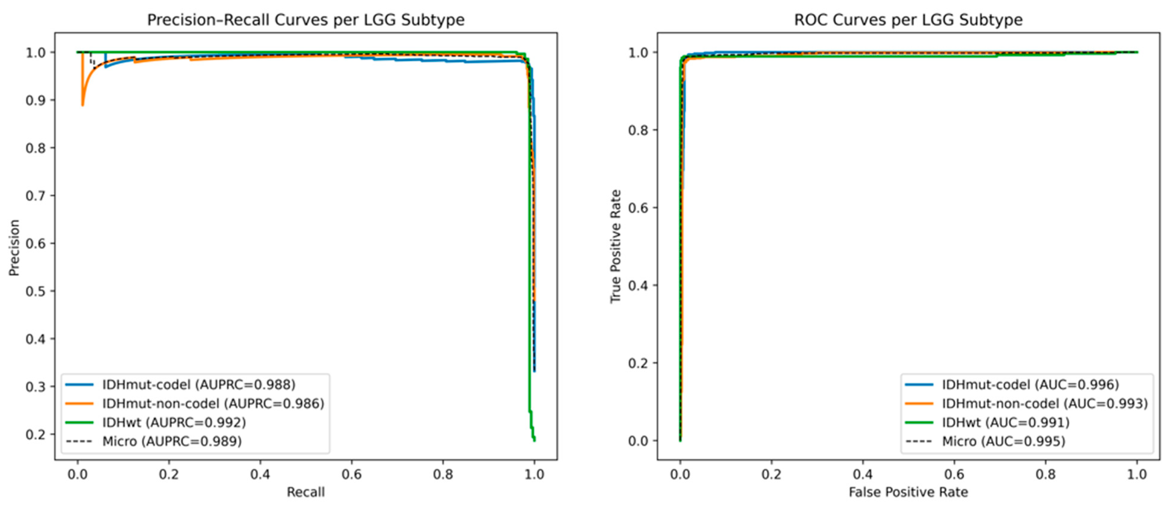 Figure 3 depicts the Precision Recall (PR) and Receiver Operating Characteristic (ROC) curves of the three major Lower-Grade Glioma (LGG) molecular subtypes, namely, IDHmut-codel, IDHmut-non-codel, and IDHwt, as predicted by the RF-GAT hybrid model. All the curves demonstrate very good classification performance on all the subtypes with AUPRC values more than 0.98 and AUC values higher than 0.99, which means a high sensitivity and good balance between precision and recall. IDHwt has the best AUPRC (0.992) and its AUC (0.991) representing strong discrimination between the mutant and wild-type classes. The almost ideal form of the curves and the low trade-off between precision and recall indicate the stability and the reliability of the model to capture the molecular signature that discriminate between LGG subtypes. This good performance shows that the combination of RF and GAT is an effective way to leverage both the topographical context obtained by local feature relevance and inter-gene topographical context obtained by the protein–protein interaction (PPI) network. The hybrid design minimizes the noises created by redundant features, as well as strengthens biologically significant relationships. In general, these findings prove that the RF and GAT hybrid model offers a discriminating and biologically interpretable model of LGG subtype classification, which can be used to support downstream activities, including prognostic modeling and biomarker discovery.